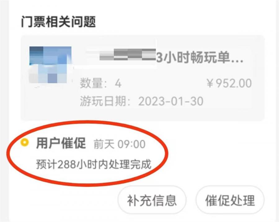 无奈之下,她再次拨打平台门票客服电话。客服回复称,由于退票手续有相关审核流程,大约需要半个小时,请朱女士耐心等待。可大半个小时过去了,她的退款申请仍没有任何进展。随后,她多次拨打平台客服电话,并通过APP催促,对方称已经有专员在加急跟进,让她“再等等”。“一开始是让我等半小时,后来说再等1小时,到了1小时又让等4小时……直到下午4点多,我已经离开滑雪场,都没有任何进展。”据朱女士回忆,据APP的退款申诉进度,一开始显示是4小时内回复,后来又显示24小时内回复,“所谓的回复,只是发送一条短信而已,短信内容就是一条跳转至APP客服的链接。”更让她感到诧异的是,到了2月1日17时之后,竟显示的是“预计288小时内处理完成”。