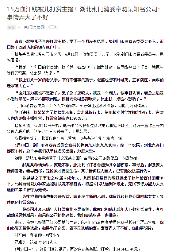 4月中旬,荆门市消费者委员会积极履职,采取正面沟通、书面敦促等组合拳成功化解一起未成年人网络游戏娱乐消费纠纷,为消费者挽回“巨额”经济损失的同时,也挽救了一个农民家庭。
