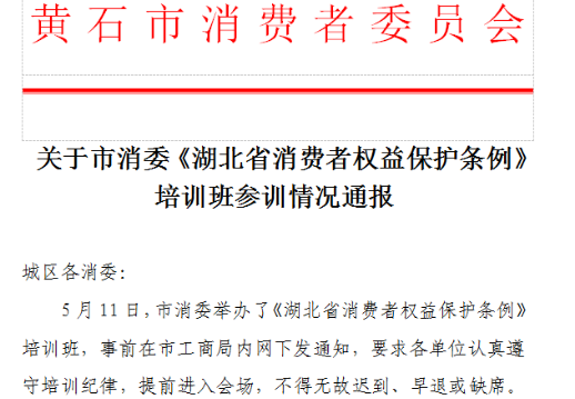 5月30日,黄石市消委以发文的形式向城区各消委通报了《条例》培训班参训情况。通过对参训率、考试优秀率均表现优异的单位公开表扬,对组织不力、无故缺席(考)、造成不良影响的单位予以点名批评,以此激发全市消委组织消费维权战线人员学习《条例》的责任感、紧迫感,提升《条例》执行力。
