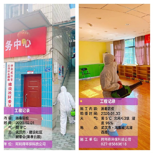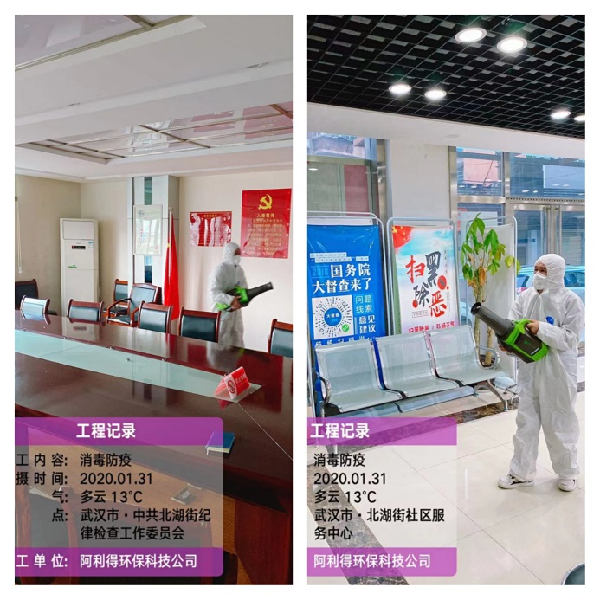 四、消毒防疫临危受命不辱使命。作为武汉消毒防疫、有害生物防治、室内空气净化行业的主力军--武汉阿利得环保有限公司,在此次疫情面前争做排头兵,积极主动、勇往直前,秉承着社会责任与担当密切配合当地政府相关部门,积极开展街道、社区、抗疫一线机关单位等场所的消毒抗疫工作,为控制疫情的蔓延贡献自己的一份力量。于2020年1月27号(正月初三)至2020年2月10号期间已经为包括华南海鲜城周边50多个社区、机关单位进行了消毒防疫,使用消毒药剂200多公斤。