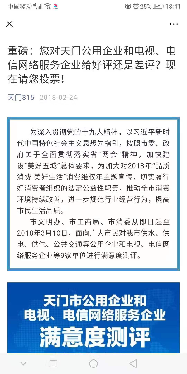 2018年,天门市消费者委员会联合原市工商局、市文明办面向广大市民对供水、供电、供气、公共交通等公用企业和电视、电信网络服务企业等9家单位进行满意度测评。2019年,组织开展全市范围内住宅小区、物业服务与管理、住宅装饰装修消费者满意度调查,市消费者委员会委托第三方调查机构通过网络投票和入户走访12000多人次。于2019年10月15日联合市市市场监督管理局及相关行业主管部门召开“全市住宅小区、物业服务与管理、住宅装饰装修消费维权约谈劝谕会”。