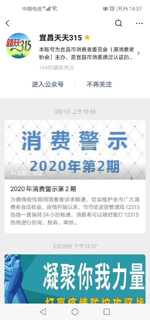 宜昌消委以官方微信号“宜昌天天315”作为宣传的主阵地,不仅推出了《数据监督 维权聚焦:消费不满意黑榜》的招牌栏目,更是在市场监管体制改革后主动作为,在数据监督中新增家用电梯的监督检查新栏目,公布每月设备的维保情况,曝光投诉量多的电梯及维保单位。同时,市消委紧扣消费热点和投诉热点,突破以往仅关注重大节假日的局限,更密切关注社会消费潮流,聚焦新型消费品,发布各类消费警示,受到广大消费者的欢迎。消委还特约律师团专家对新型消费现象和典型案例及时评论,从法律层面深刻分析了侵犯消费者权益应承担的法律责任。